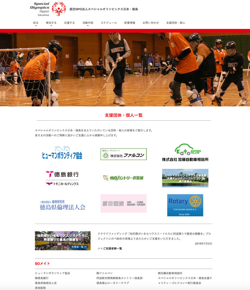 | バナー広告 | スペシャルオリンピックス日本・徳島では、バナー広告も随時募集しています。 一口 10,000円 一口に付き、巾200pixel X 高さ40pixel、静止画像(JPEG又はGIF)にて1年間掲載させていただきます。 スペシャルオリンピックスの活動費用、サイトの維持・運営の費用として活用させていただきます。 ご協力のほどよろしくお願いします。 |